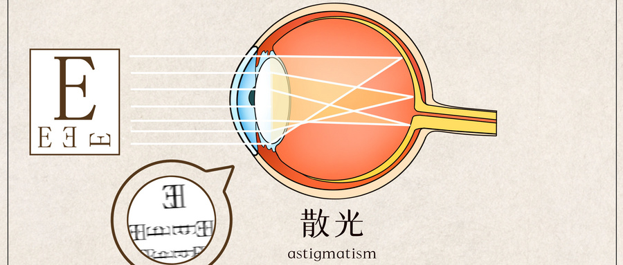 由于角膜形態(tài)或晶狀體等表面不規(guī)則,光線通過眼球折射后無法匯聚成焦點(diǎn)。嚴(yán)重散光者看近看遠(yuǎn)均不清楚。